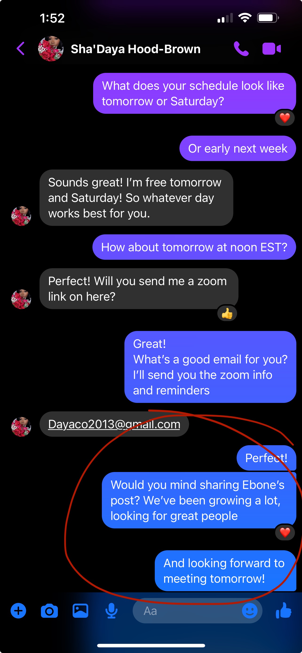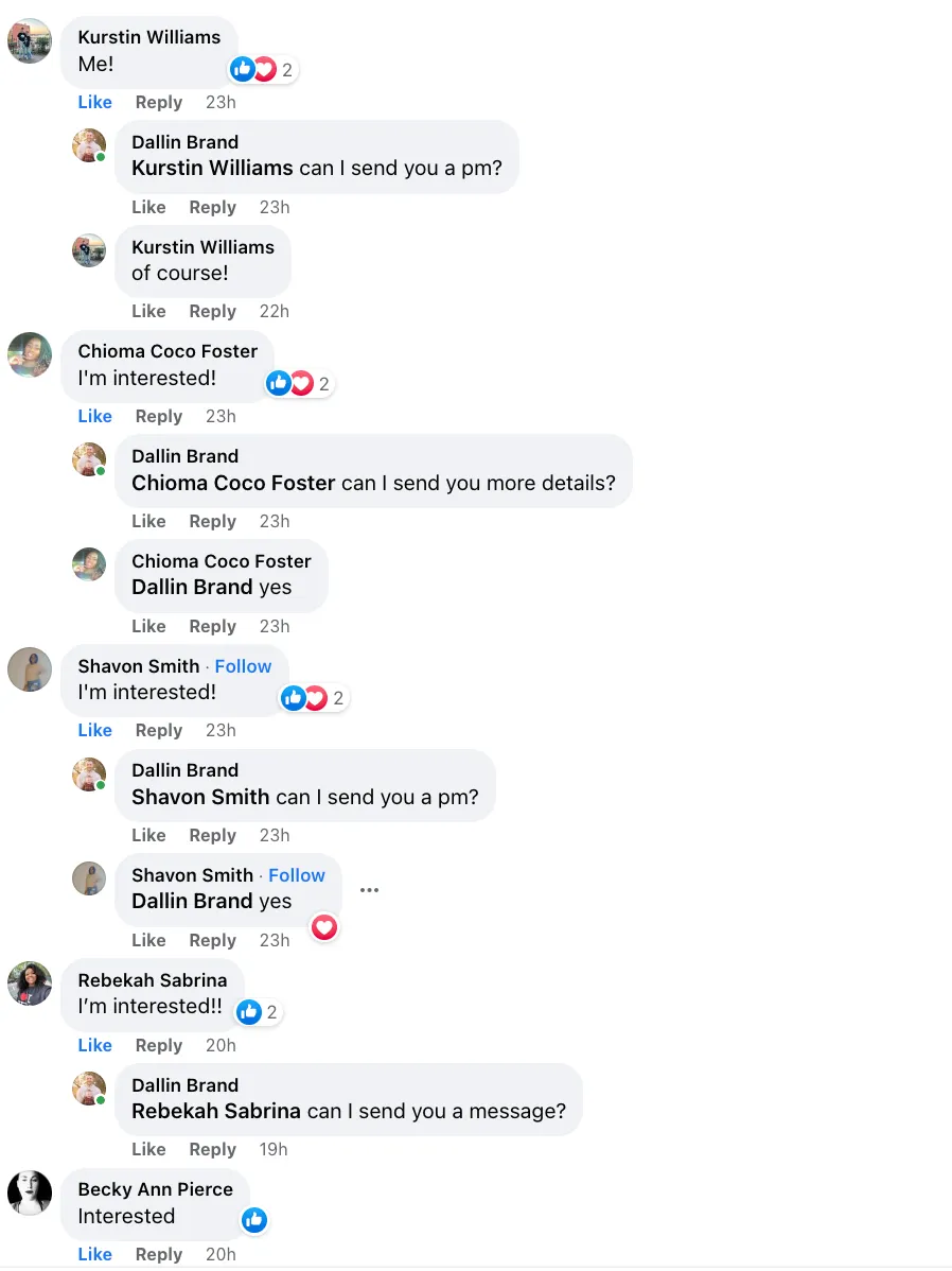 4. Have the TRAINEE create a group text with anyone that expresses interest and comments on the post or DMs them. The group text will include 3 people: the TRAINER, TRAINEE, and the INTERESTED PERSON. Have the TRAINEE use this script to create the group message: ▪️Hey Thanks for the interest in my post! My friend (TRAINER NAME) is the Owner & President, they can give you more information, because I'm still pretty new. (TRAINER NAME) can you help us as to the information of the positions available?